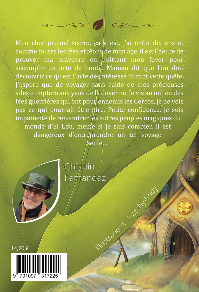 Mon cher journal secret, ça y est, j’ai enfin dix ans et comme toutes les fées et féons de mon âge, il est l’heure de prouver ma bravoure en quittant mon foyer pour accomplir un acte de bonté. Maman dit que l’on doit découvrir ce qu’est l’acte désintéressé durant cette quête. J’espère que de voyager sans l’aide de mes précieuses ailes comptera aux yeux de la doyenne. Je vis au milieu des fées guerrières qui ont pour ennemis les Corcos, je ne vois pas ce qui pourrait être pire. Petite confidence, je suis impatiente de rencontrer les autres peuples magiques du monde d’El Lou, même si je sais combien il est dangereux d’entreprendre un tel voyage seule…